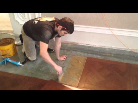 Для нанесения используют зубчатый шпатель. Паркетный клей равномерно распределяют по основанию. Плашки вдавливают в клеевой слой, а затем подгоняют при помощи молотка или подбивочного бруска.